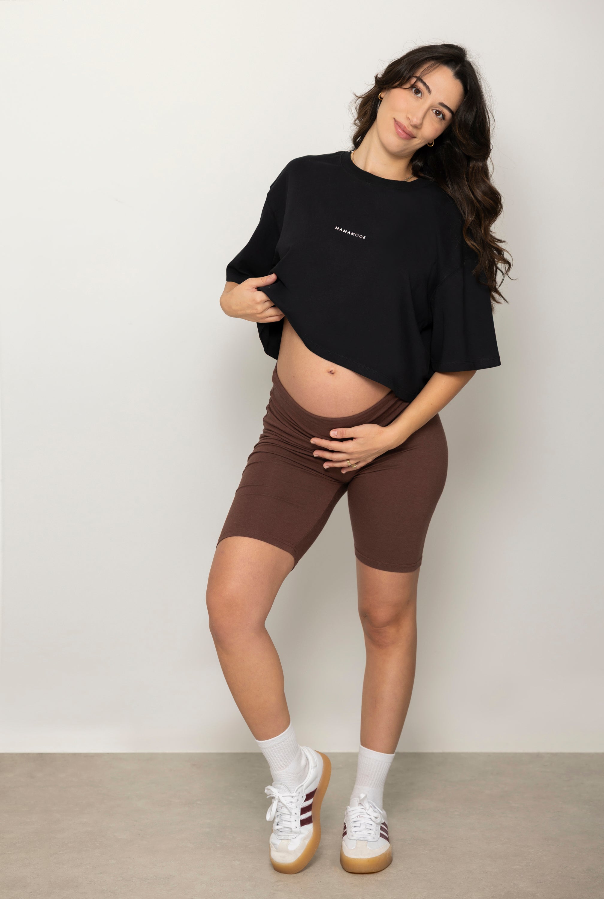 Samantha (our pregnant model) is wearing a size Small. She was a size Small pre-pregnancy.